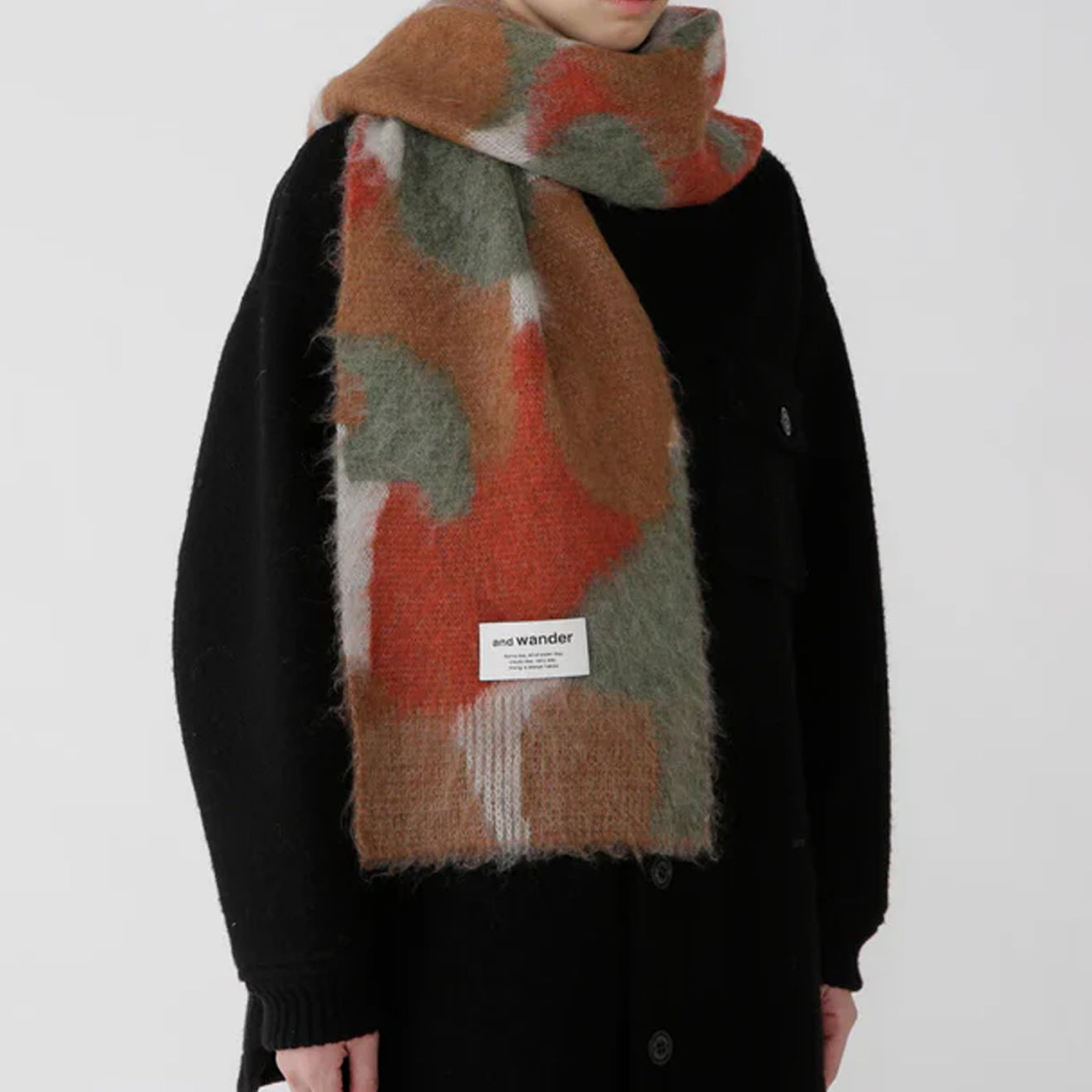 Normaler Preis €164,95The And Wander Mix Color Shaggy Knit Stole in Black Mix brings distinctive texture and warmth to cold-weather layering. Knitted in a bold 5G double jacquard with a custom camouflage pattern, it blends acrylic, nylon, wool, and mohair yarns. Both sides are brushed for an ultra-soft finish, creating depth and comfort in equal measure.