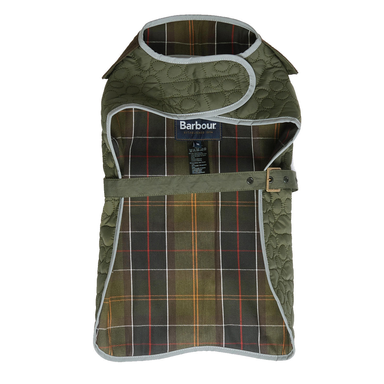 Normaler Preis €52,95Der Barbour Paw Quilt Hundemantel in Oliv hält Ihr Haustier warm und ist gleichzeitig stylisch. Mit seinem durchgehenden Pfotensteppmuster und dem klassischen Barbour-Tartan-Futter ist dieser Mantel sowohl praktisch als auch modisch. Er verfügt über eine praktische Öffnung zum Befestigen einer Leine und ermöglicht so den bequemen Einsatz beim Spaziergang.