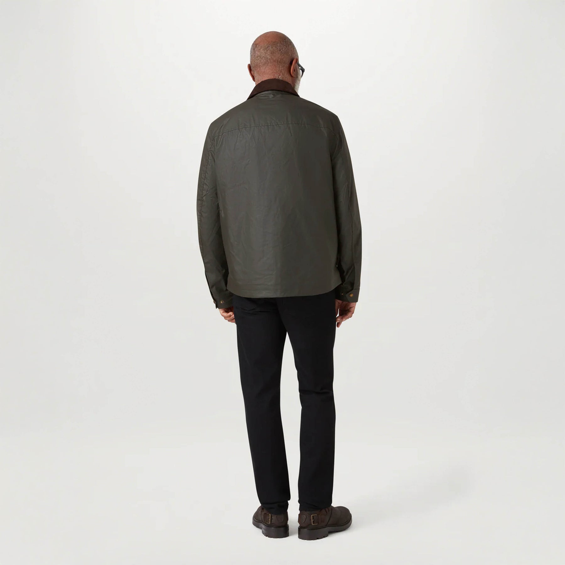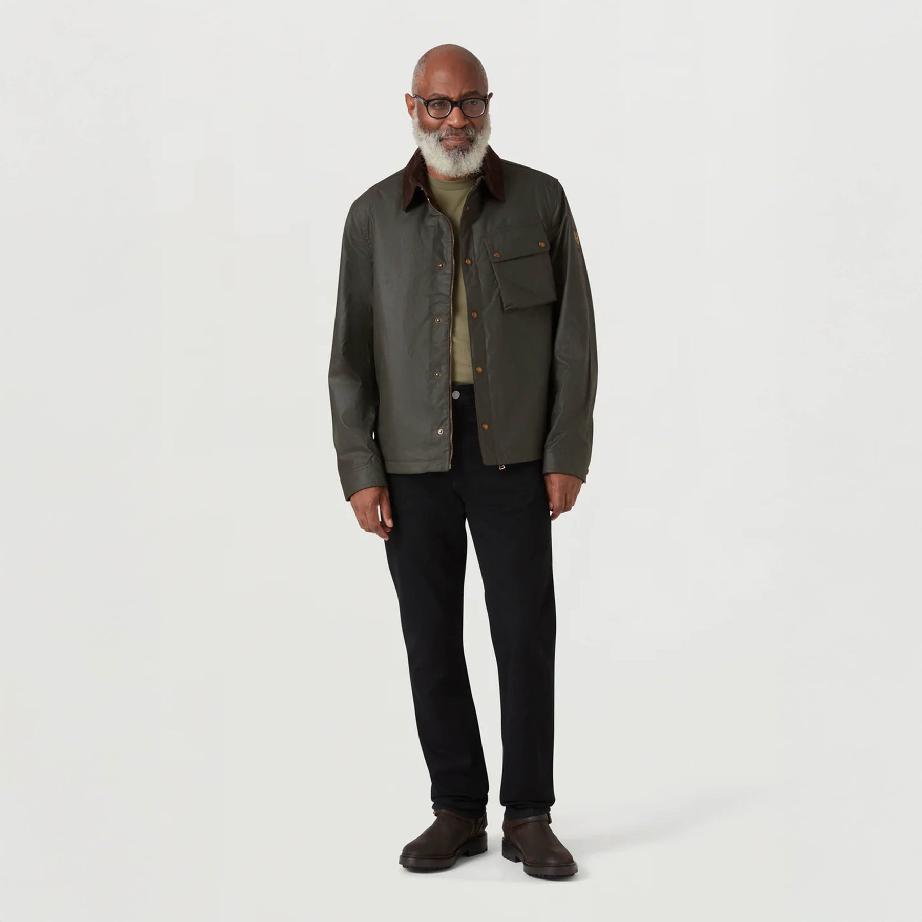 Normaler Preis €409,95Die Belstaff Ground Jacket in Faded Olive ist aus 6 oz gewachster British Millerain-Baumwolle gefertigt und bietet zuverlässigen Schutz vor Wasser und Wind. Der Cordkragen, antike Messingbeschläge und mit Druckknöpfen verstellbare Manschetten verleihen ihr einen zeitlosen Look.