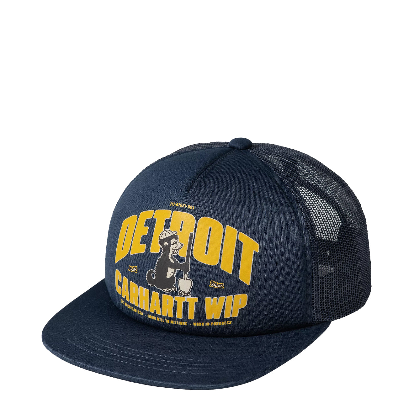 Normaler Preis €58,95Die Underground Trucker Cap von Carhartt WIP in Blau ist ein Fünf-Panel-Modell aus Polyesterschaum und verfügt über einen stabilen, flachen Schirm mit einem Grafikdruck auf der Vorderseite.