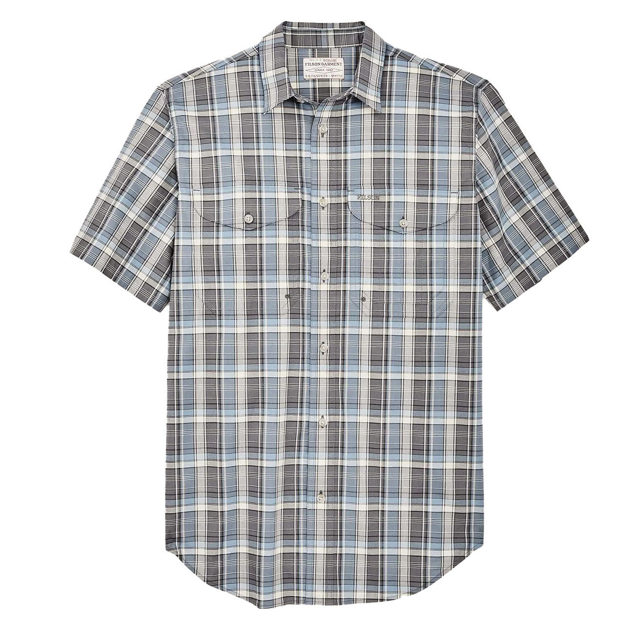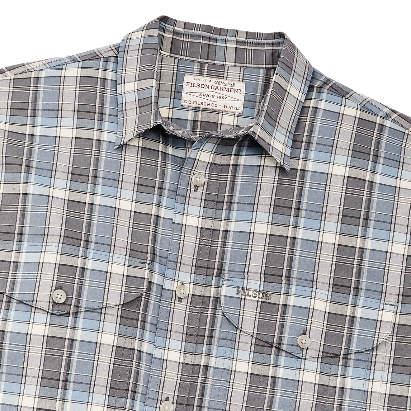 Normaler Preis €152,95Filson Twin Lakes Kurzarm-Sporthemd in Grau/Blau/Creme. Ein Favorit für warmes Wetter. Die Twin Lakes verfügen über einen leichten Stretchanteil für absolute Bewegungsfreiheit, egal ob beim Trockenfliegenwerfen in Wüstenbächen, beim Wandern in Bergseen oder beim Staken mit dem Skiff über die Wattflächen. Das Polyestermischgewebe leitet Feuchtigkeit vom Körper ab, trocknet schnell und blockiert schädliche UV-Strahlen. Die Brusttaschen sind zur Sicherheit mit Knopfklappen versehen, und auf der linken Seite befindet sich ein geschlitzter Werkzeugaufnäher für griffbereites Zubehör. Gestickte Ösen unter den Armen sorgen für Belüftung und in den Taschenböden für Wasserabfluss. Knopfverschluss vorne. Stehkragen.