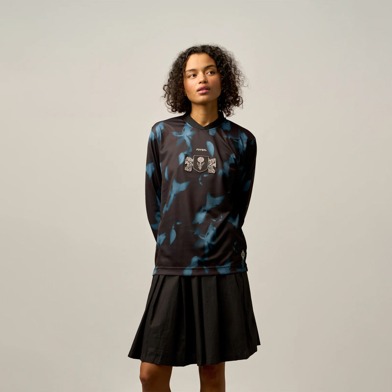Normaler Preis €146,95 €116,95 Sparen 20% SonderpreisThe Futsol Long Sleeve Jersey in Sunpaper Dark Angels combines artistic design with modern performance. Its bleached sunpaper pattern is inspired by English pagan lore, and the embroidered Futsol crest adds a gothic touch. Crafted from recycled polyester, this top is moisture-wicking, anti-odour, and perfect for casual or sporty wear.