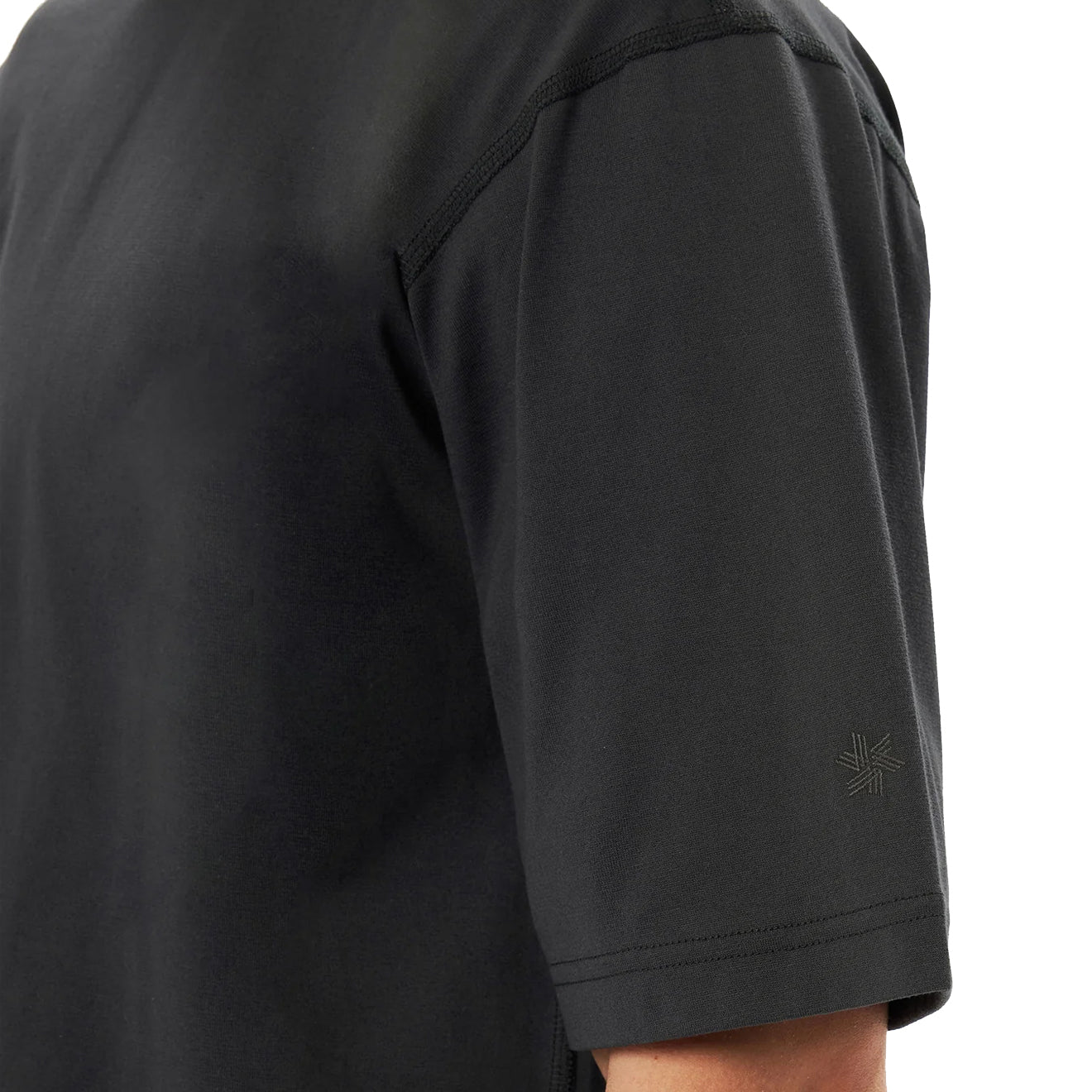 Normaler Preis €117,95Das Goldwin Re-Optimum P/J Oversized T-Shirt in Tintenschwarz ist ein erholungsorientiertes Kleidungsstück mit KODENSHI-Technologie, die die natürlichen Infrarotstrahlen des Körpers reflektiert und so eine angenehme Wärme aufrechterhält, die ideal zum Entspannen ist. Gefertigt aus extralangem Bio-Baumwoll-Strick bietet es eine glatte, flauschige Textur mit raffiniertem Fall. Die übergroße Halbarm-Silhouette sorgt für eine entspannte und dennoch elegante Passform und eignet sich sowohl zum Entspannen als auch für den Alltag in der Stadt. Dieses T-Shirt wurde unter der Leitung von Dr. Norinaga Shimizu, einem Spezialisten für Gesundheit und Umweltanpassung, entwickelt und verbindet wissenschaftliche Innovation mit höchstem Komfort und Stil.