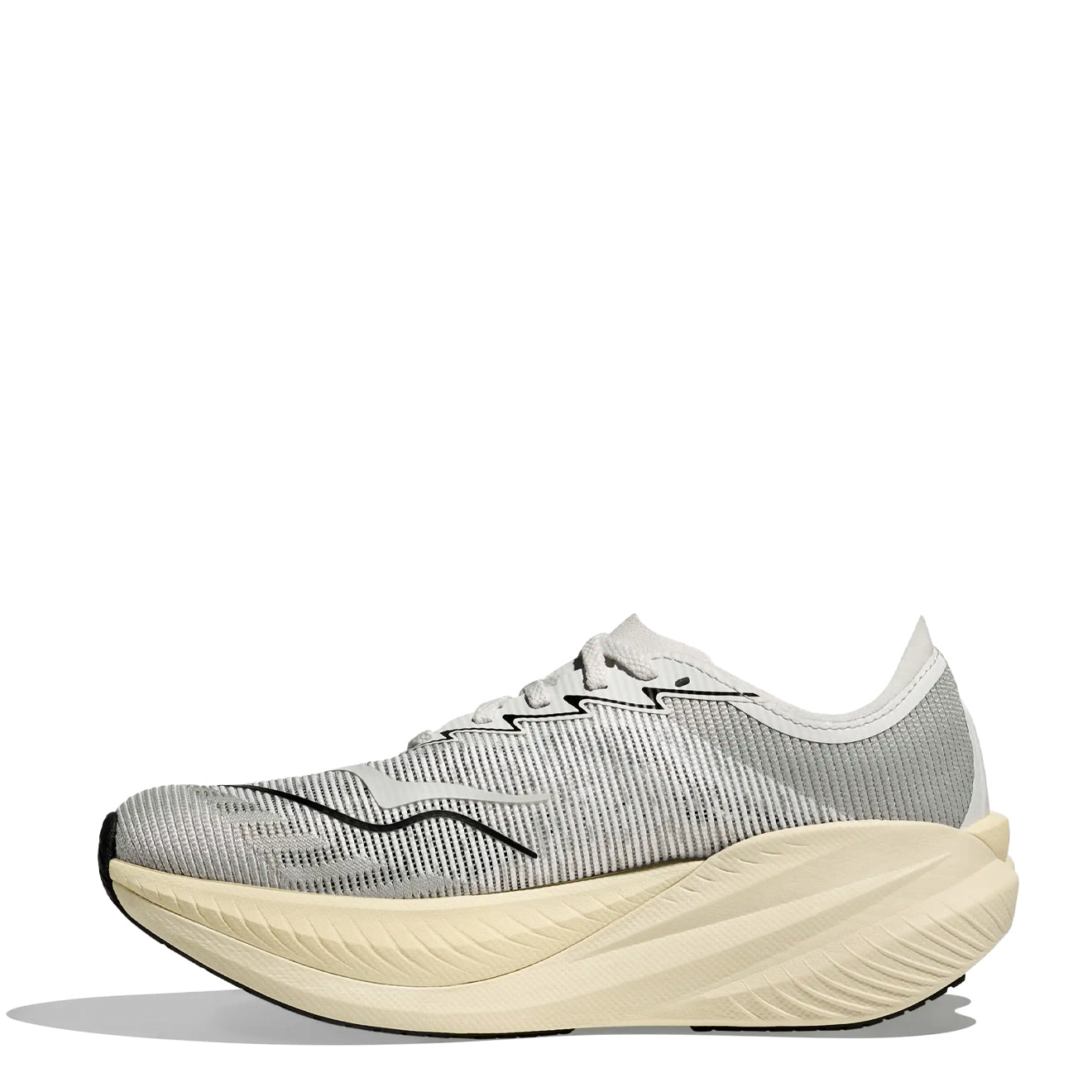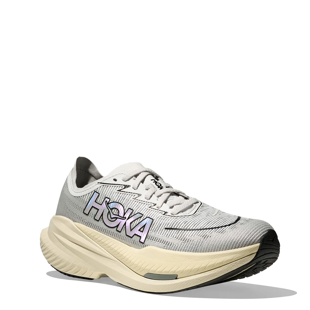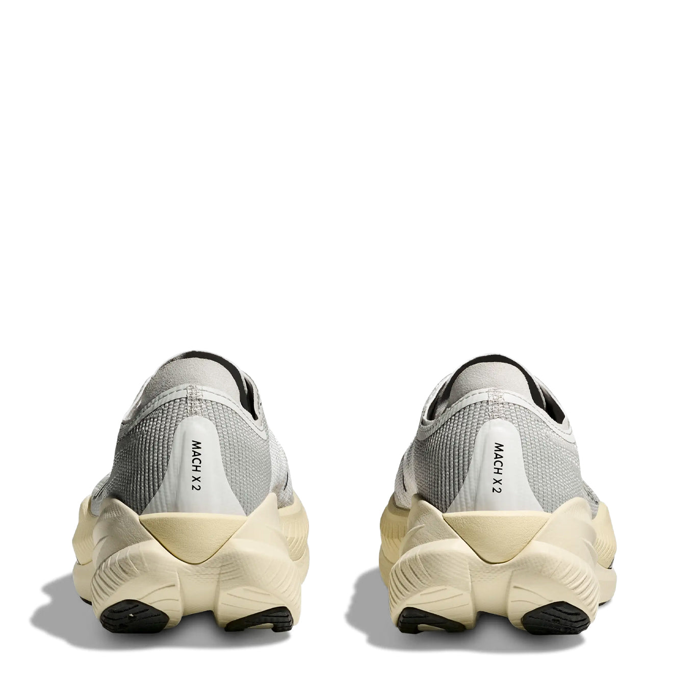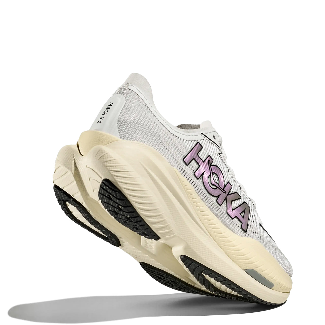 Der Hoka Mach X 2 Trainer in Weiß / Cosmic Grey ist auf Geschwindigkeit ausgelegt und kombiniert rennsportinspirierte Geometrie mit modernster Technologie. Mit einer PEBA-beschichteten Zwischensohle und einer verlängerten Pebax®-Platte für verbesserten Vortrieb bietet dieser Schuh hervorragenden Halt und einen sanften, aggressiven Zehenabdruck. Das atmungsaktive, gewebte Obermaterial und der schlanke Kragen sorgen für Komfort und Leistung bei intensivem Tempotraining und machen ihn zur ultimativen Wahl für Training auf höchstem Niveau.