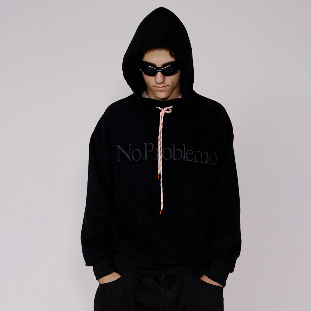 Normaler Preis €174,95Das No Problemo Reverse Fleece Sweatshirt in Schwarz ist ein Kapuzensweatshirt aus gebürstetem Jersey-Fleece aus 100 % Baumwolle.