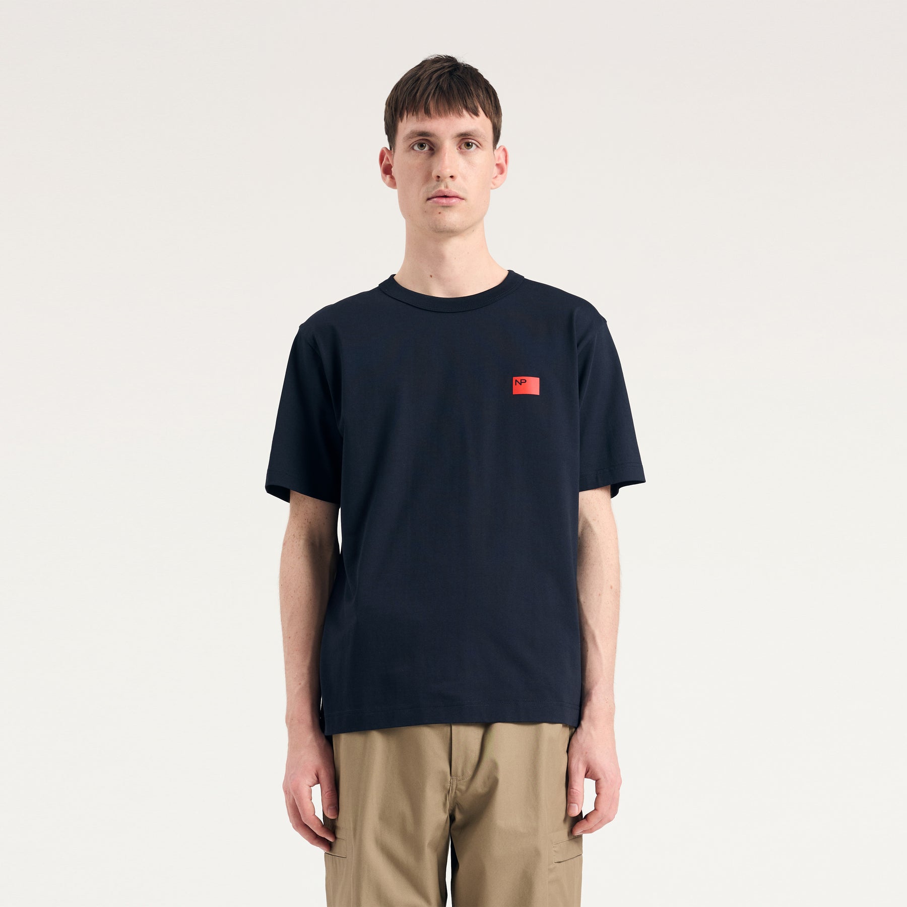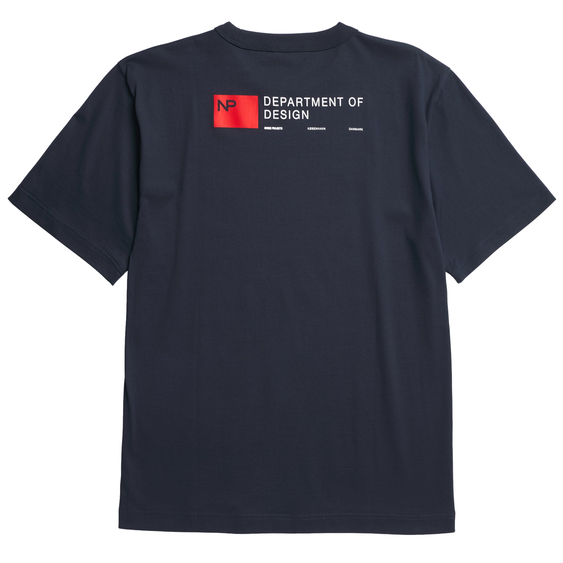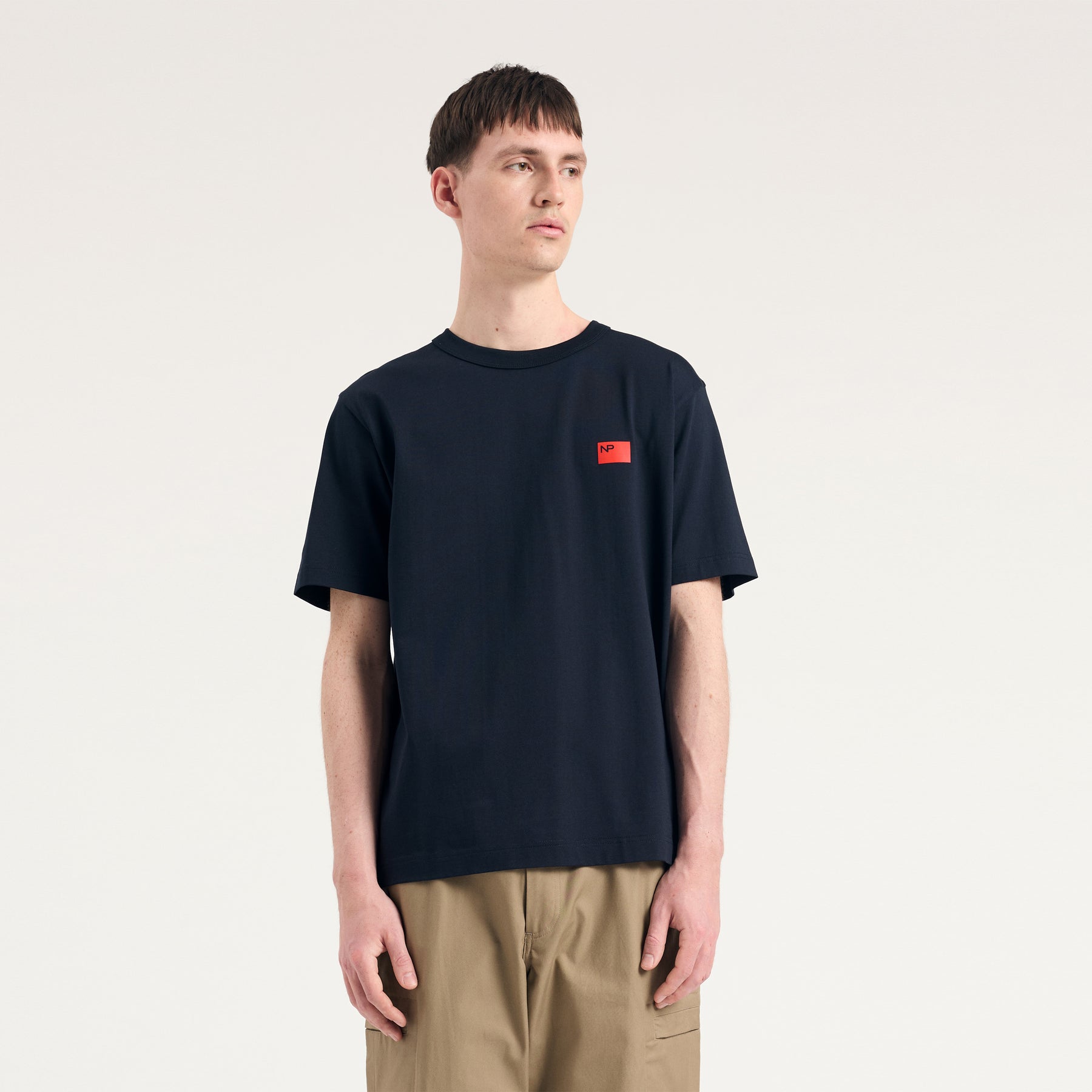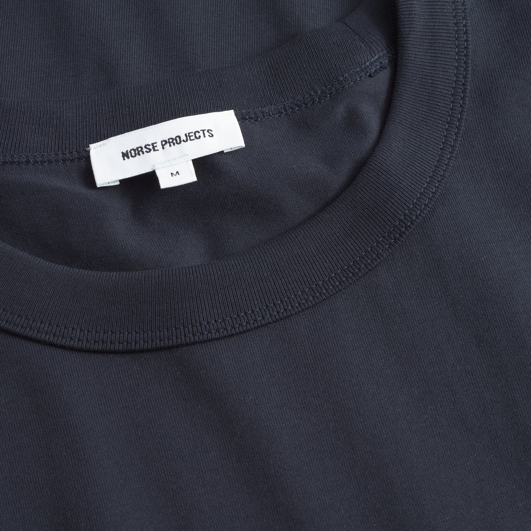 Das Norse Projects Holger Organic Optic Print T-Shirt in Dunkelblau ist aus mittelschwerem Bio-Baumwolljersey gefertigt und bietet eine entspannte, bequeme Passform. Es verfügt über ein Siebdruck-Artwork auf Brust und Rücken, gerippte Einfassungen am Halsausschnitt und Doppelnaht an Saum und Bündchen für ein sauberes, strapazierfähiges Finish.