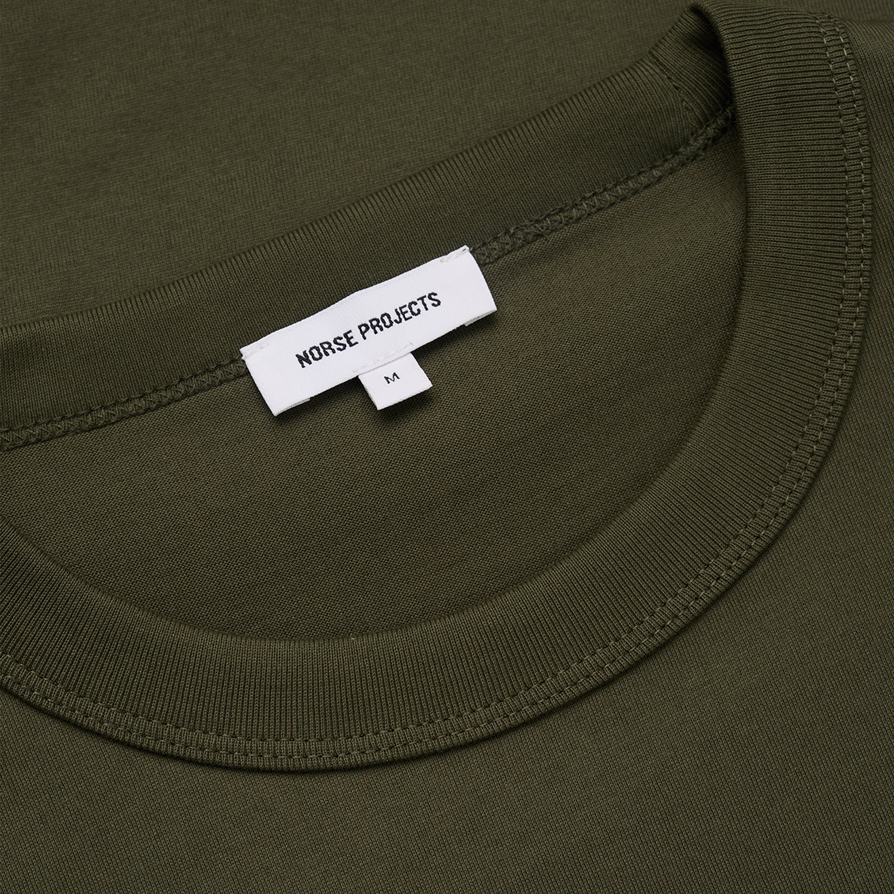 Normaler Preis €87,95Das Norse Projects Holger Organic Optic Print T-Shirt in Olive Night ist aus mittelschwerem Bio-Baumwolljersey gefertigt und bietet eine entspannte, bequeme Passform. Es verfügt über ein Siebdruck-Artwork auf der Rückseite, eine gerippte Einfassung am Halsausschnitt und Doppelnaht an Saum und Bündchen für ein sauberes, strapazierfähiges Finish.