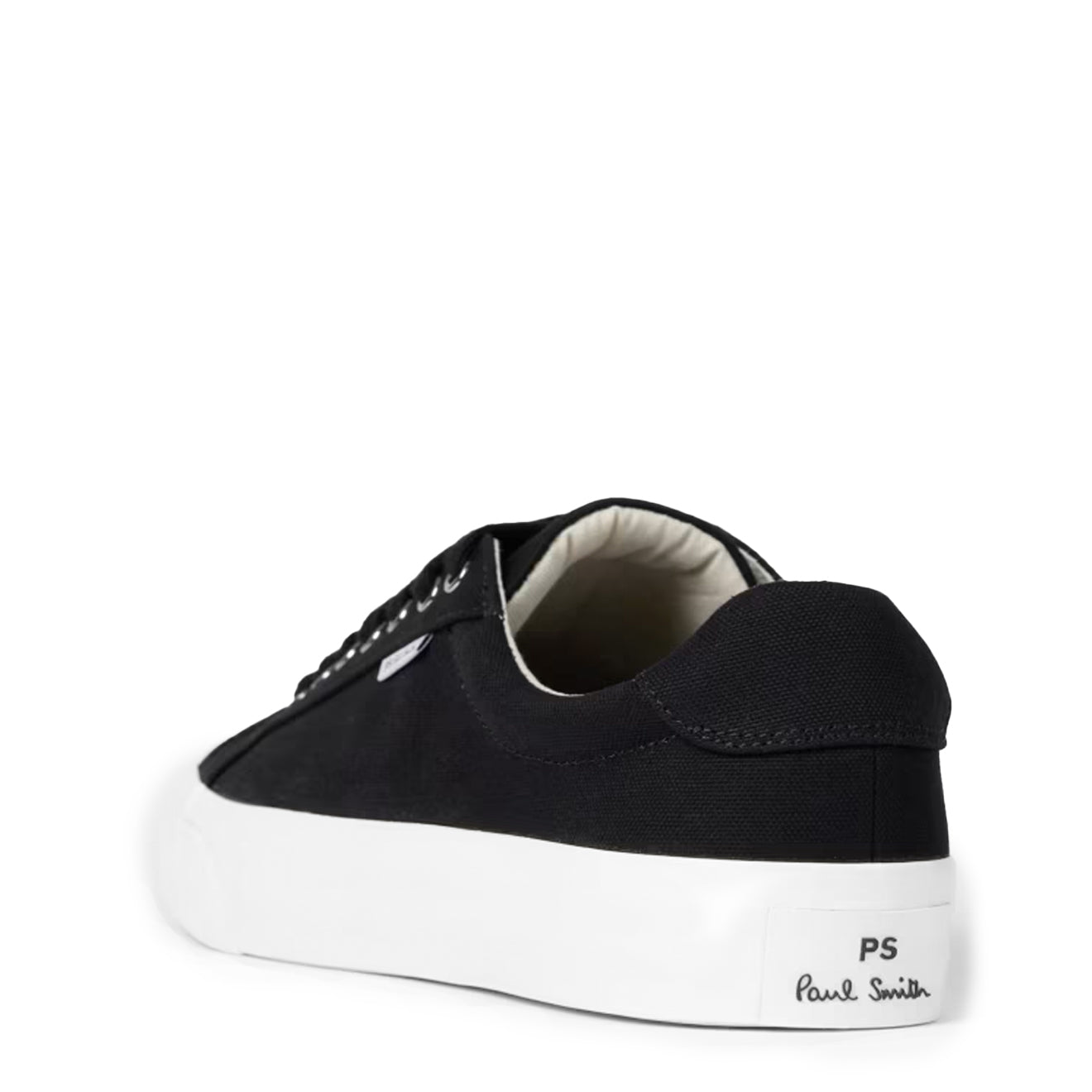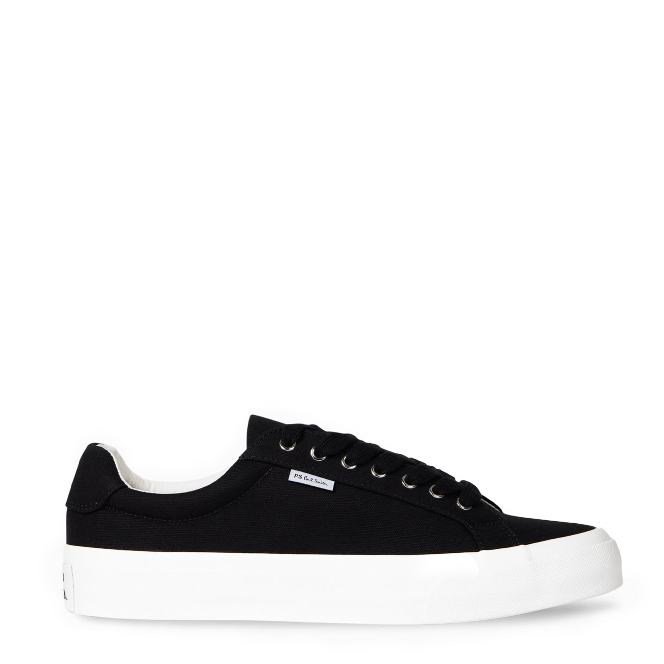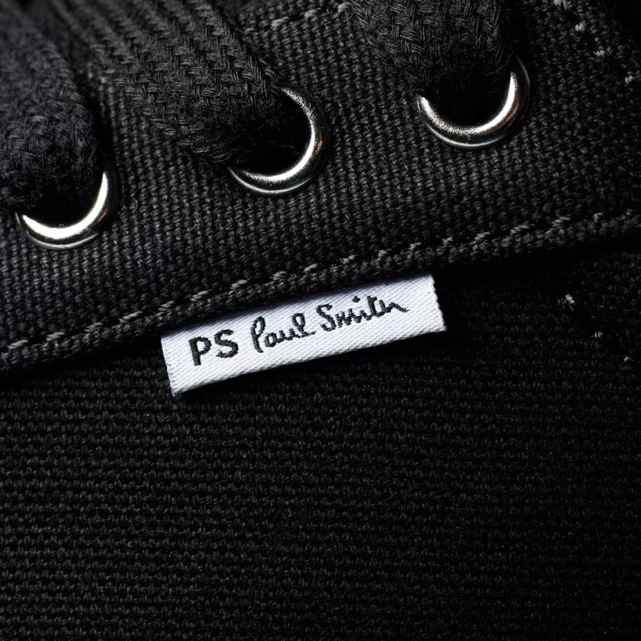 Die Paul Smith Amos Canvas-Sneaker in Schwarz bestehen aus 100 % Baumwoll-Canvas und bestechen durch ihr klassisches Design mit vulkanisierten weißen Gummisohlen und farblich abgestimmten Schnürsenkeln. Ein PS Paul Smith-Logo an der Seite sorgt für ein dezentes Branding, während das „Sports Stripe“-Detail auf der Innensohle für einen charakteristischen Farbtupfer sorgt.