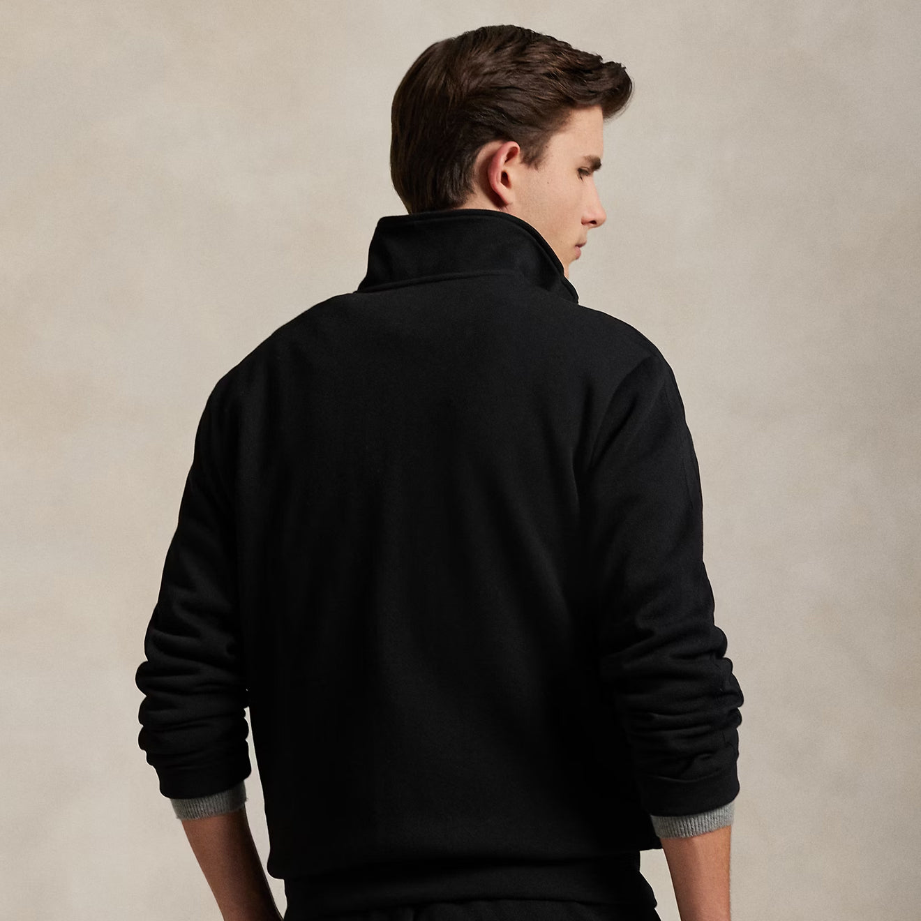 - Mockneck with rib-knit facing. Full-zip front.