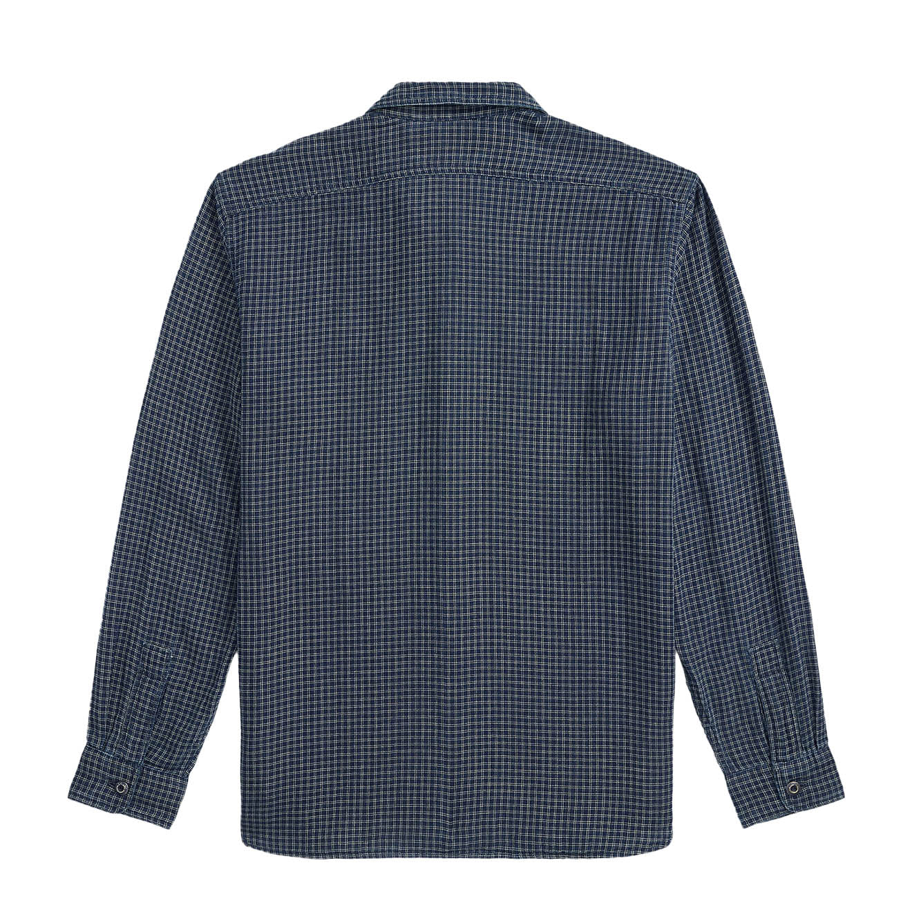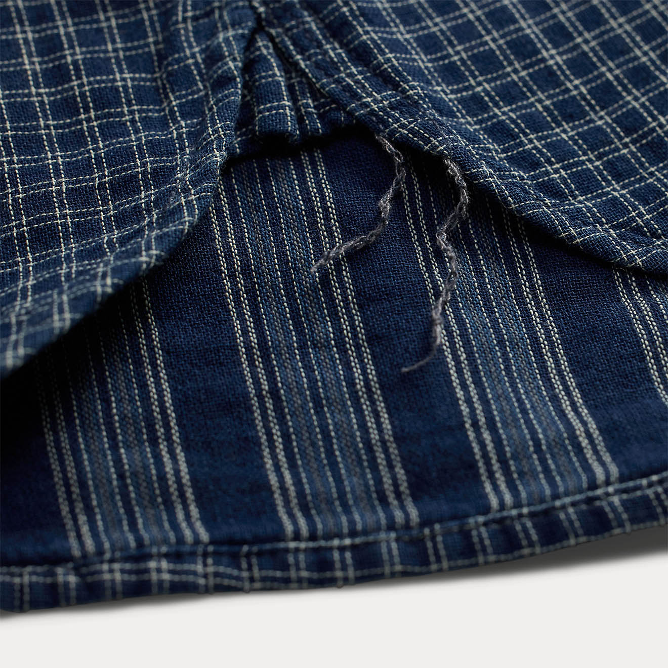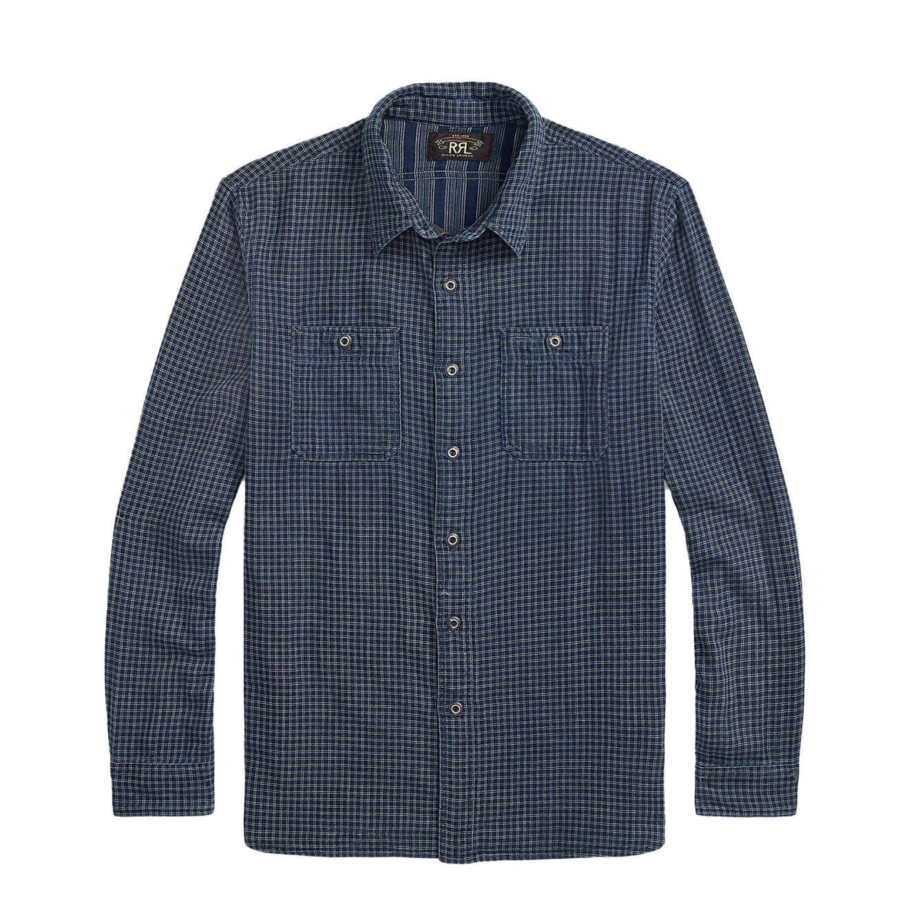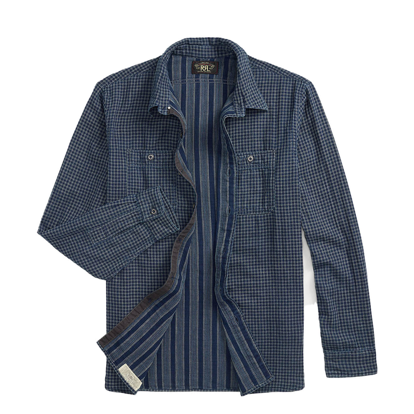Das karierte doppelseitige Arbeitshemd von RRL By Ralph Lauren in Indigoblau besteht aus leichter, atmungsaktiver doppelseitiger Baumwolle. Das mit echtem Indigo garngefärbte Hemd hat eine karierte Außenseite und eine gestreifte Innenseite. Metallknöpfe sorgen für einen zeitlosen, von Arbeitskleidung inspirierten Look.