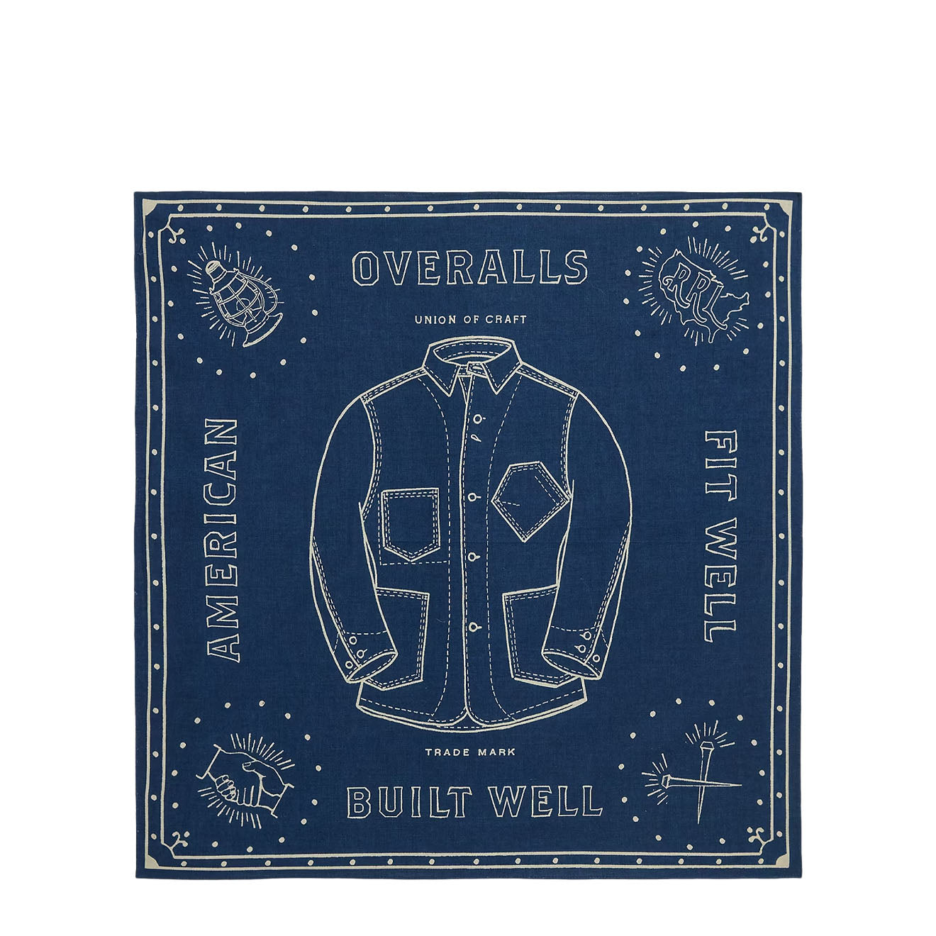 - Jackengrafik in der Mitte aufgedruckt. „Overalls“, „Fit Well“, „Built Well“ und „American“ entlang der Ränder aufgedruckt. „RRL“ in der oberen rechten Ecke aufgedruckt.