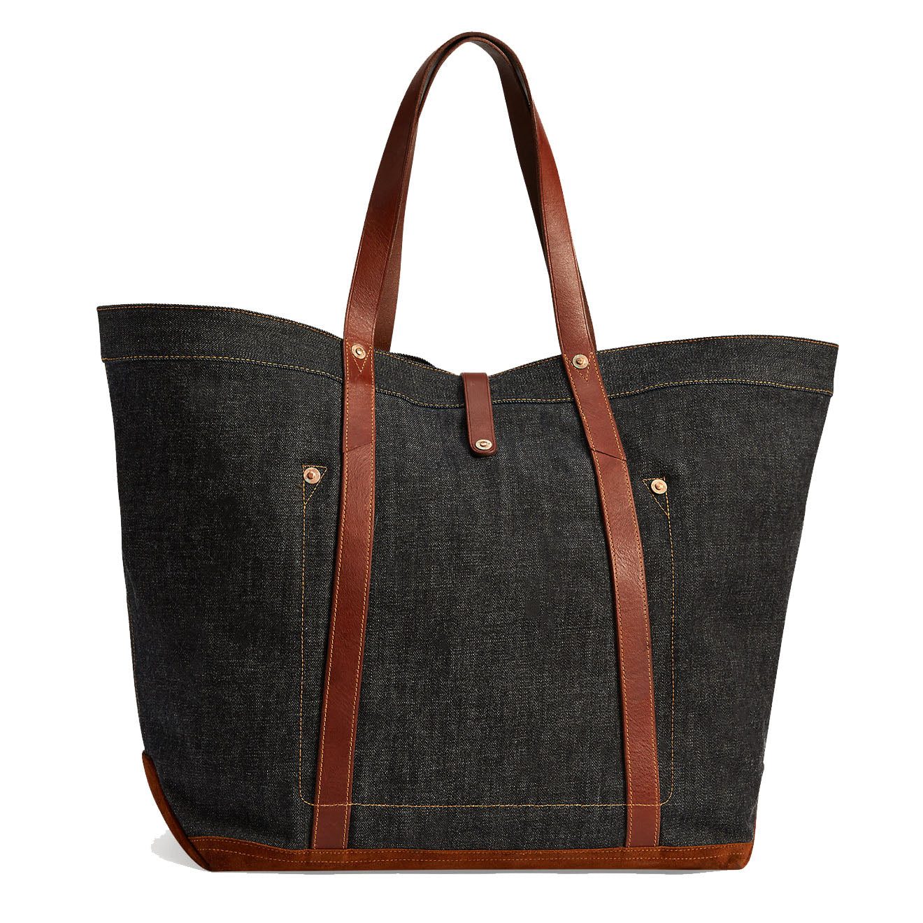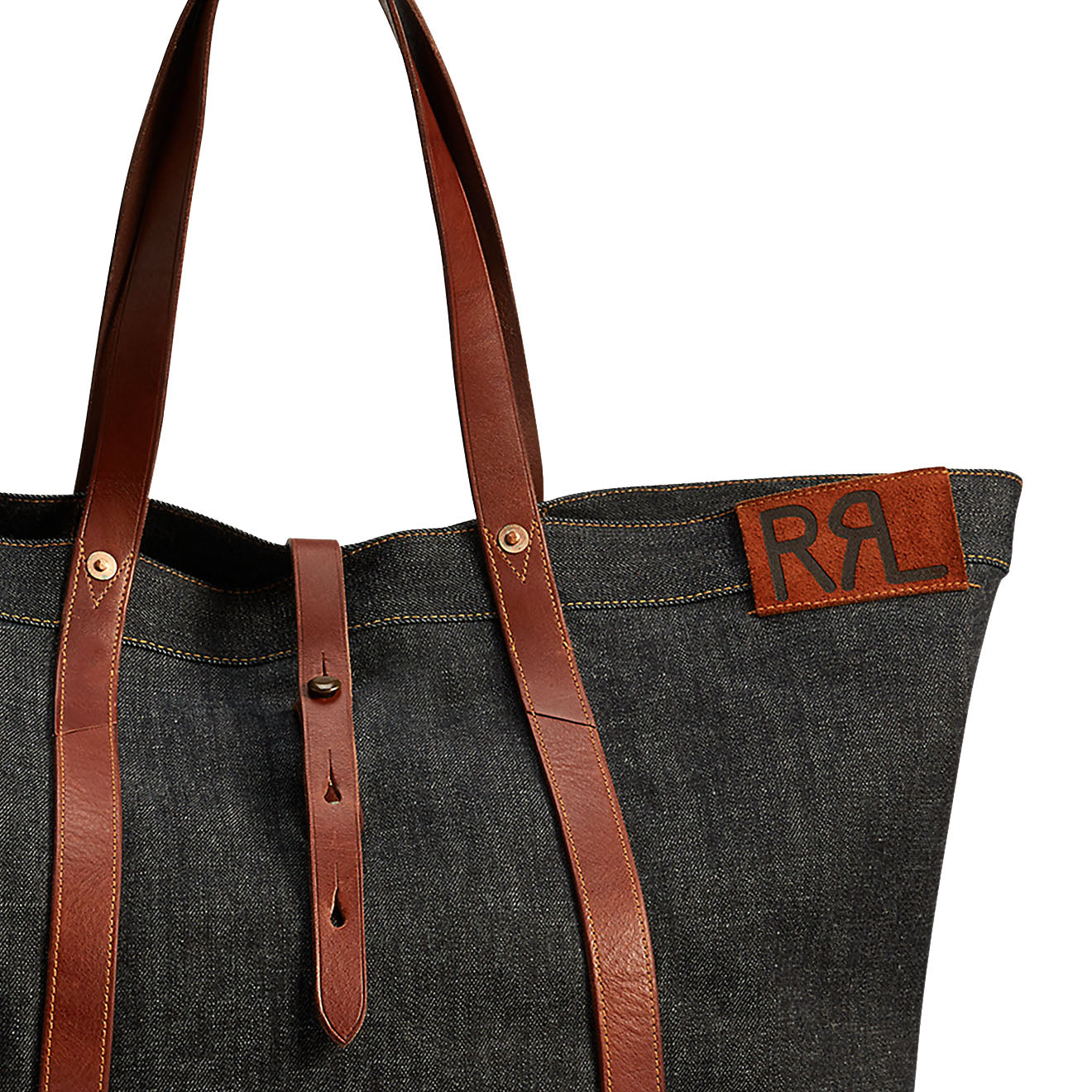 Normaler Preis €398,95Die RRL by Ralph Lauren Howard Tote aus japanischem Baumwoll-Denim, der mit echtem Indigo gefärbt wurde, verfügt über zwei Tragegriffe aus pflanzlich gegerbtem italienischem Leder. Die Basis besteht aus rauem Wildleder und ist mit einem Logo-Patch und handgehämmerten kupferfarbenen Nieten versehen. Der umklappbare Lederriemen an der Vorderseite wird mit einem Druckknopfverschluss gesichert. Wildleder-Patch mit „RRL“-Prägung an der Vorderseite.