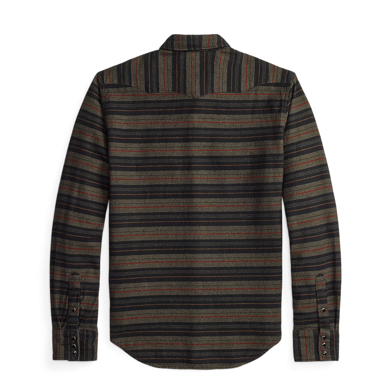 The RRL by Ralph Lauren Slim Fit Plaid Twill Western Shirt in Dark Navy Multi is crafted from yarn-dyed cotton twill with a soft, fluid drape. Cut in Double RL’s slimmest Western Fit, this shirt is trim through the body and sleeves, featuring classic Western-inspired details and authentic snap fastenings throughout.