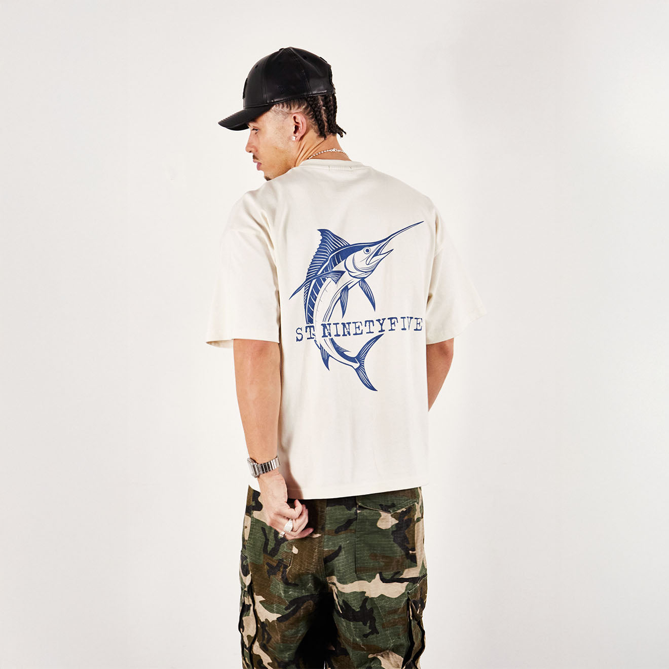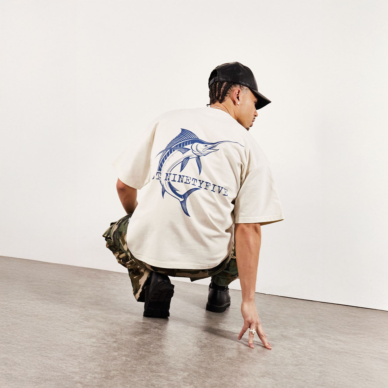 Normaler Preis €104,95The ST-95 x Anna Bergonzini Swordfish T-Shirt in Off White celebrates the brand’s 30th anniversary by revisiting its early graphic identity through a contemporary lens. Created in collaboration with Anna Bergonzini, the first designer to shape ST95’s visuals alongside Massimo Osti, the T-shirt draws on archival graphics while maintaining a clean, modern silhouette. The boxy fit and 290 GSM cotton jersey give it structure and weight, while the left chest and back prints, including the swordfish motif, add subtle movement and character.