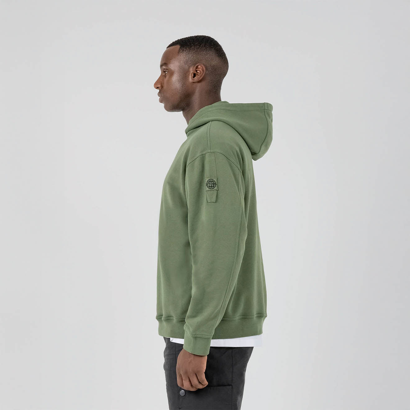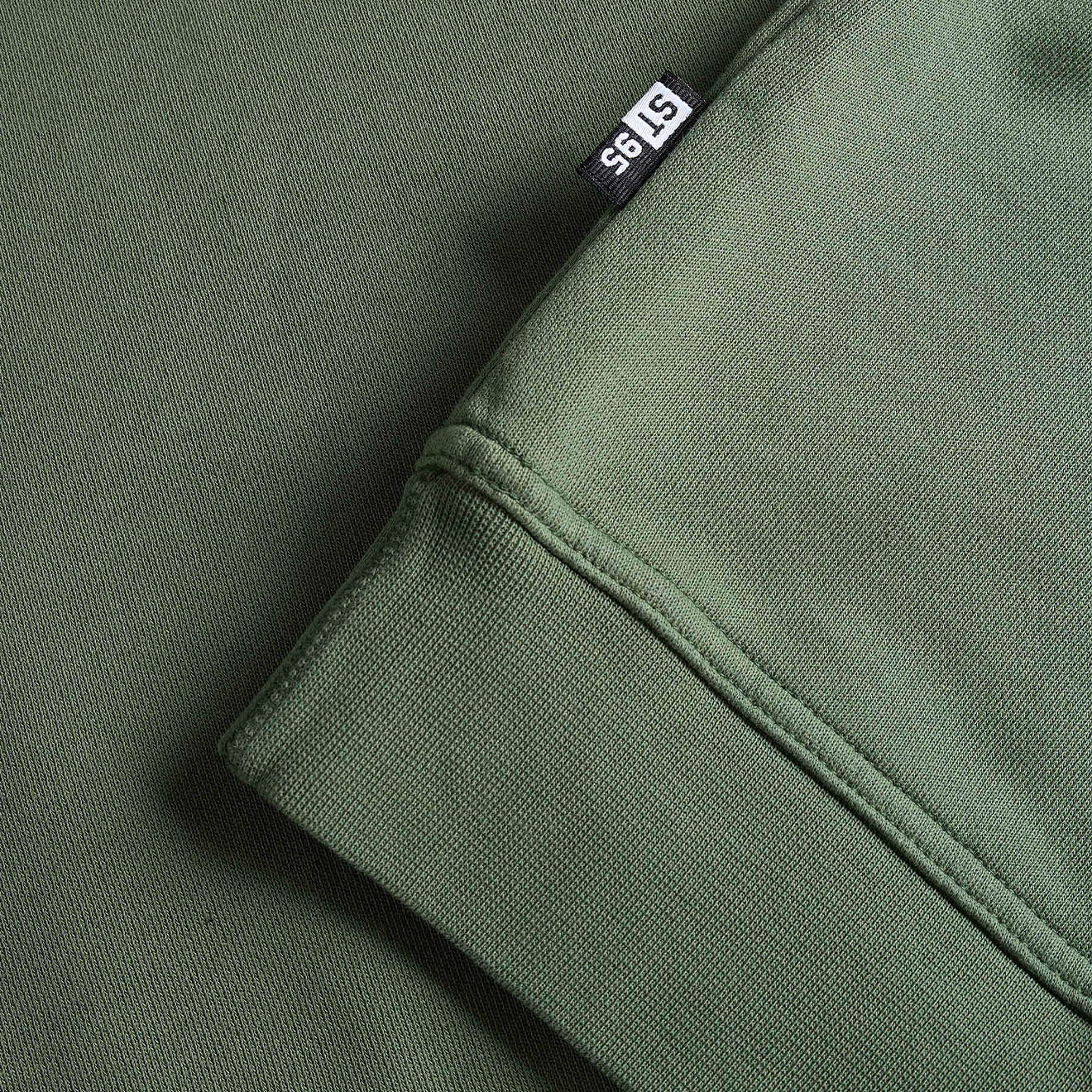 The Sole Nucleo Oversized Hoodie combines ST95’s signature comfort with functional design. Made from 450GSM organic cotton, the hoodie is garment-dyed in a deep Four Leaf Clover green for a rich, earthy tone. Ribbed cuffs and hem frame the oversized silhouette, while a small appliquéd patch on the left sleeve adds subtle branding, reflecting the label’s refined approach to casual wear.
