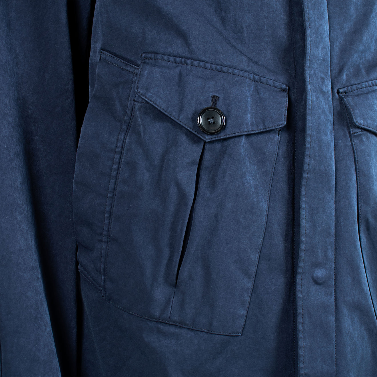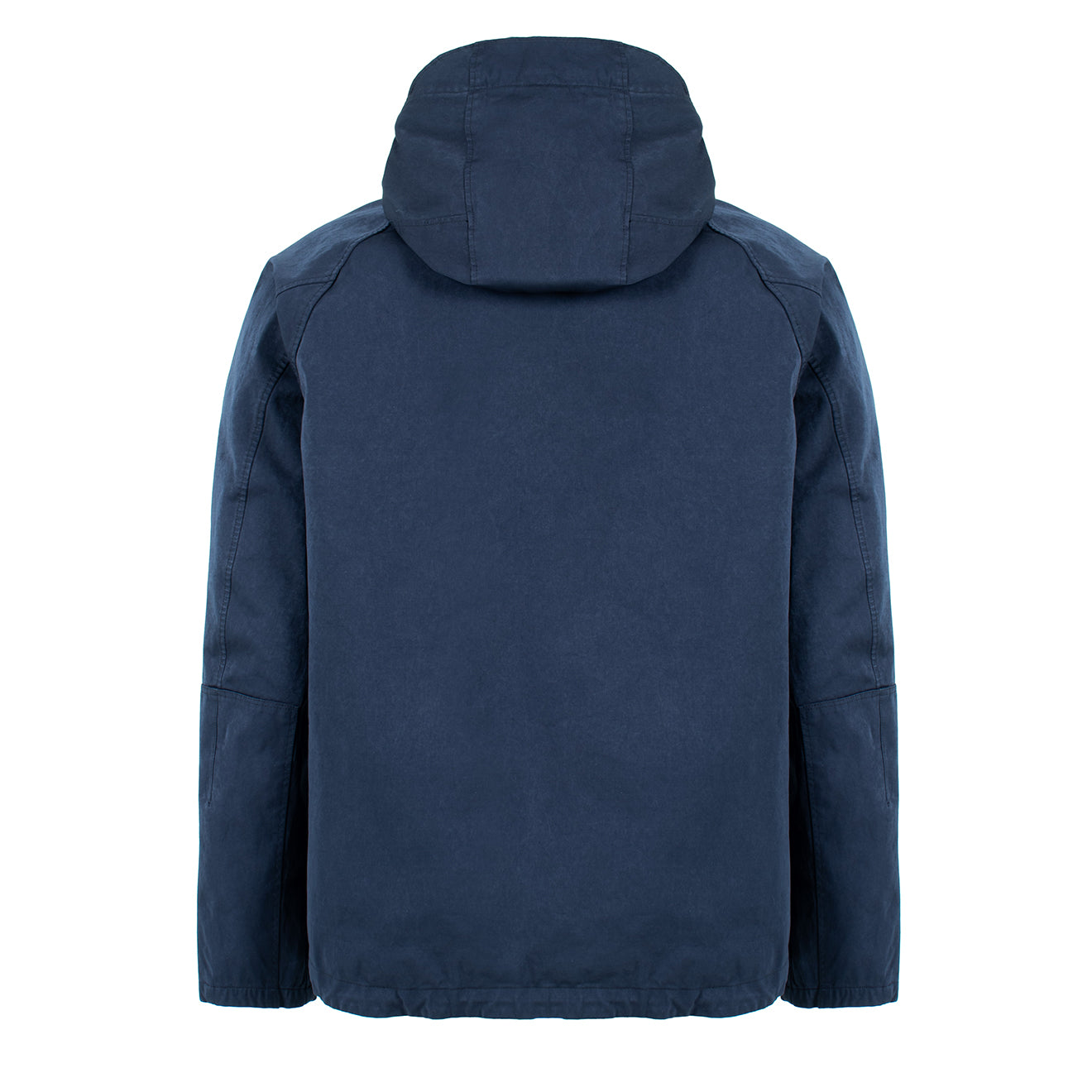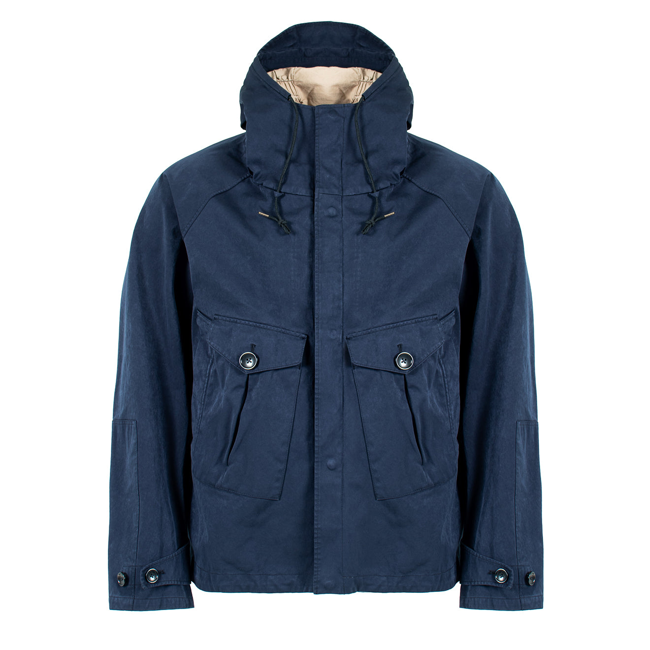 Ten C Tempest-Jacke mit Kapuze und 2 Taschen in Marineblau. Der Tempest Anorak ist eine offene Version des klassischen Feld- oder Tarn-Überzieh-Smocks von Ten C. Die extra große Kapuze wurde ursprünglich entwickelt, um jede schützende Kopfbedeckung zu umschließen und somit zu tarnen. Raglanärmel werden für diese Überzieher am häufigsten verwendet, da sie leichter anzuziehen sind und besser über anderen Jacken sitzen.